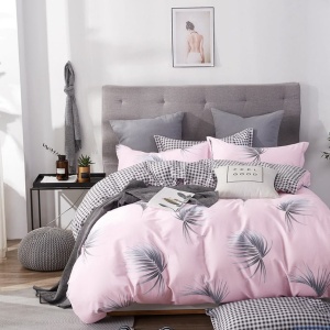 Komplet pościeli 160x200cm z prześcieradłem różowa popielate liście kratka