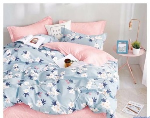 Komplet pościeli dwustronnej 160x200cm drobne kwiatki niebieskim tle/kropeczki białe na pudrowym różowym tle.