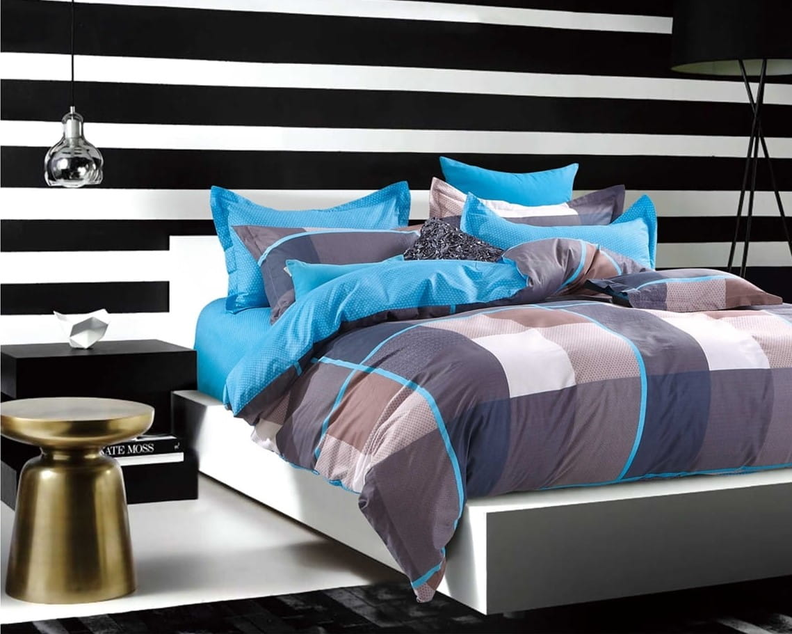 Komplet pościeli dwustronnej 160x200 cm w kratkę niebiesko brązowa