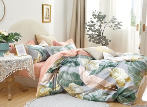 Komplet pościeli dwustronnej 200x220 cm liście i paski na różowym tle