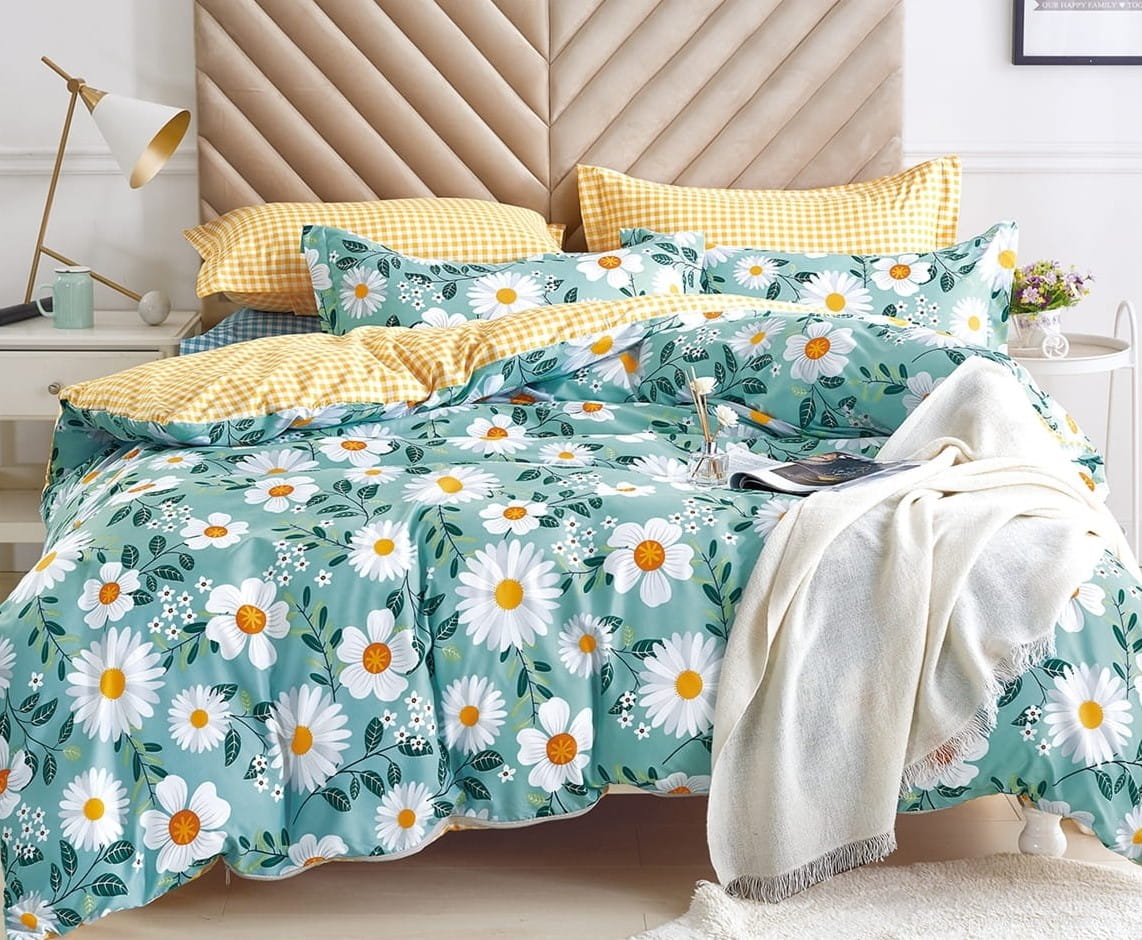 Komplet pościeli dwustronnej 200x220 cm stokrotki cyjanowa żółto biała kratka (1)