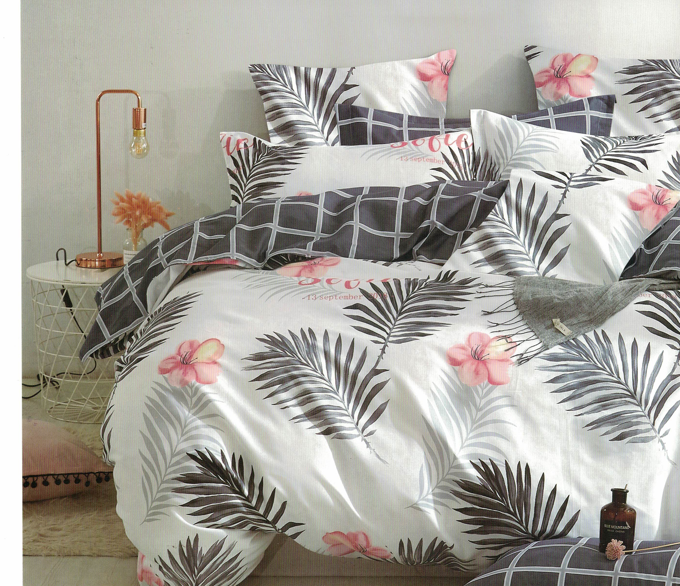 Komplet pościeli dwustronnej bawełna satynowa 160x200 biało popielata liście kwiaty