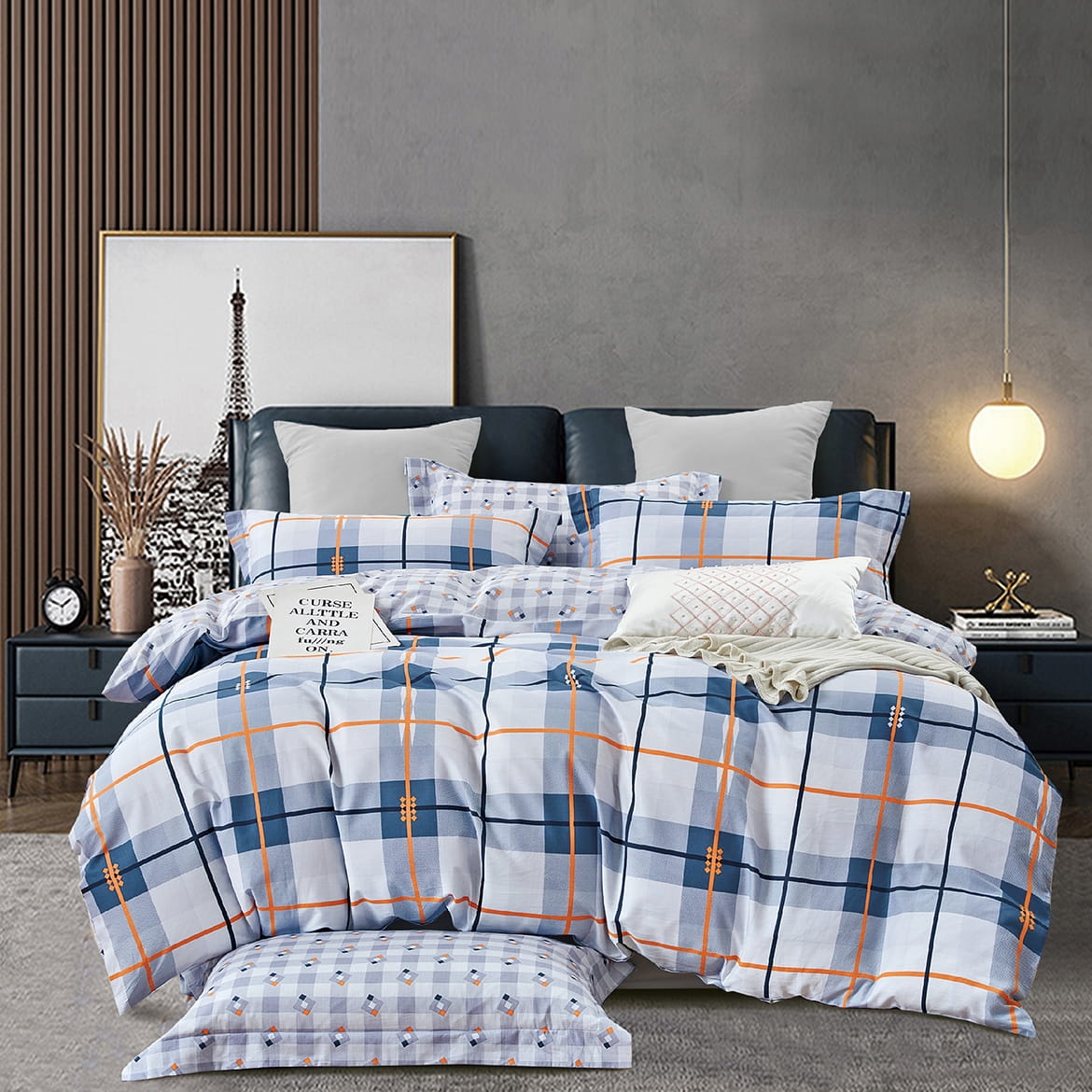 Komplet pościeli dwustronnej bawełna satynowa 200x220 cm niebieska kratka z pomarańczowym
