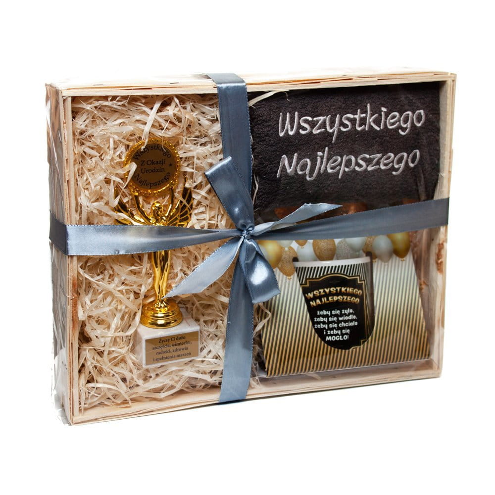 Zestaw na Urodziny ręcznik grafitowy z kubkiem i złota statuetka Wszystkiego Najlepszego